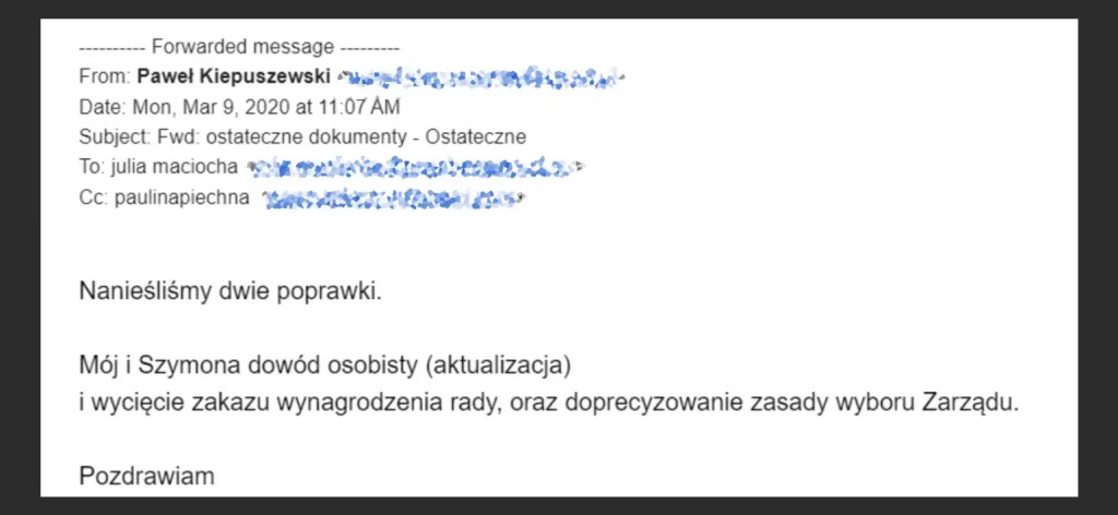Kiepuszewski miał wówczas także wyrażać wprost oczekiwanie zmian w statucie, które umożliwiłyby Fundatorom wejście do Zarządu Fundacji. W rzeczywistości taka zmiana miała miejsce w styczniu 2017 r., a w marcu 2020 r. Fundatorzy po prostu próbowali zmienić zasady wyboru Zarządu oraz wprowadzić możliwość wynagradzania Rady Fundacji. Świadczy o tym mejl od samego Kiepuszewskiego, który 9 marca 2020 r. przesyła do Maciochy takie właśnie poprawki do Statutu.