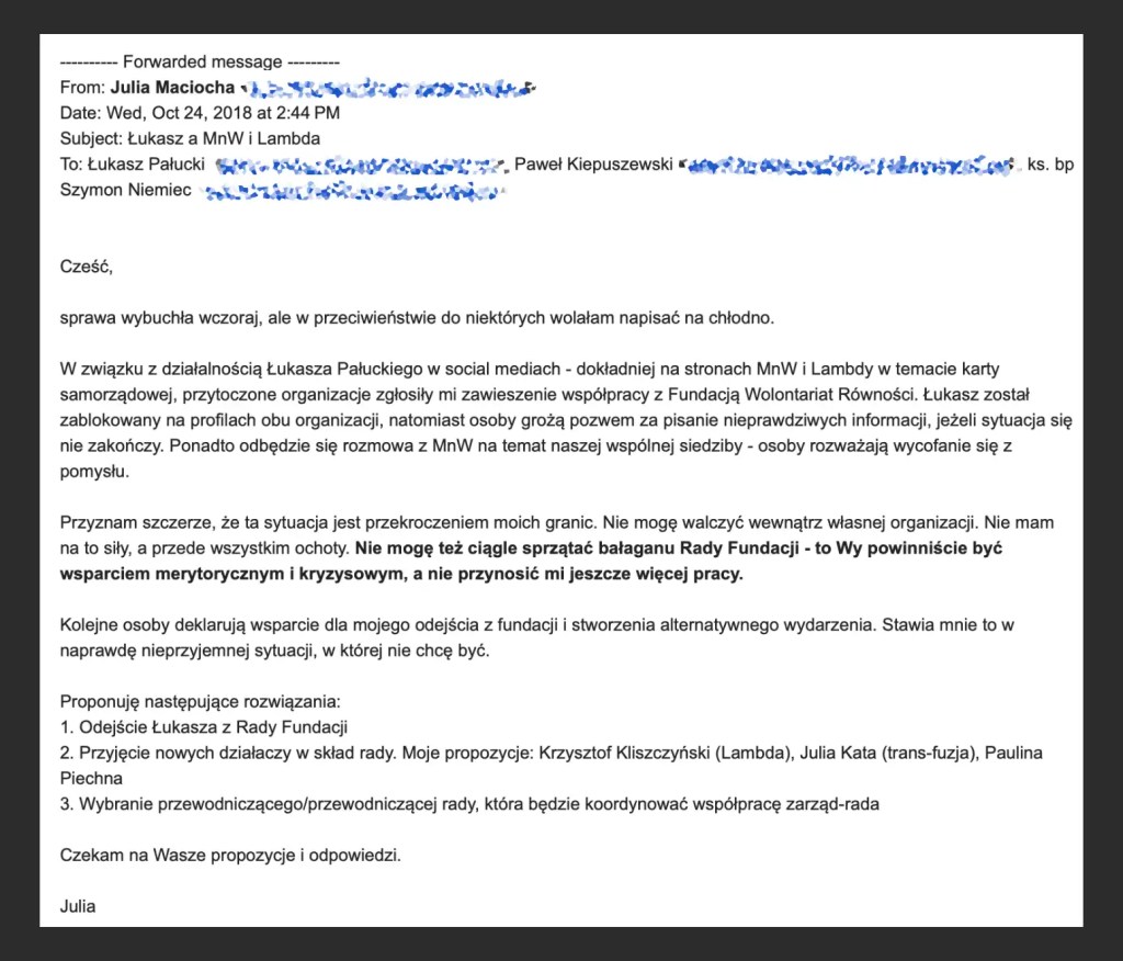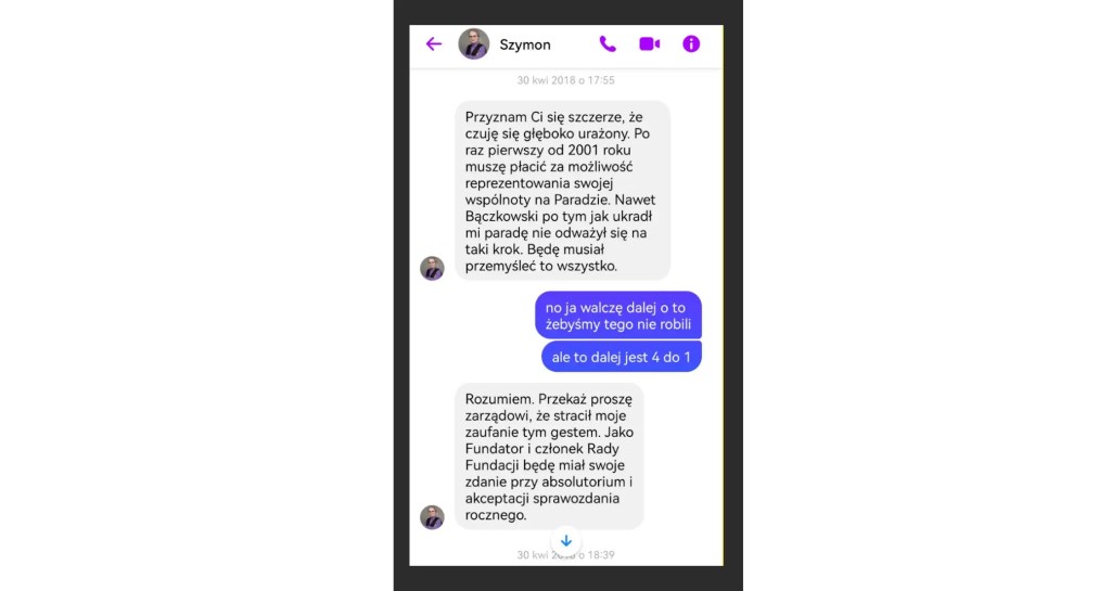 Tymczasem Fundatorzy wysuwali swoje oczekiwania finansowe, szantażując Zarząd np. nieprzyjęciem sprawozdania finansowego. W kwietniu 2018 r. Szymon Niemiec miał pretensje o opłatę za stoisko dla swojej wspólnoty religijnej w Miasteczku Równości, które towarzyszy Paradzie Równości. Julia Maciocha obiecała zajęcie się tą sprawą, wskazując, że decyzje będzie podejmować pięcioosobowy Zarząd. W reakcji na to Szymon Niemiec prosi o przekazanie pozostałym osobom z Zarządu, że Zarząd utracił jego zaufanie, co będzie miał na uwadze przy udzielaniu absolutorium i akceptacji sprawozdania finansowego Fundacji.