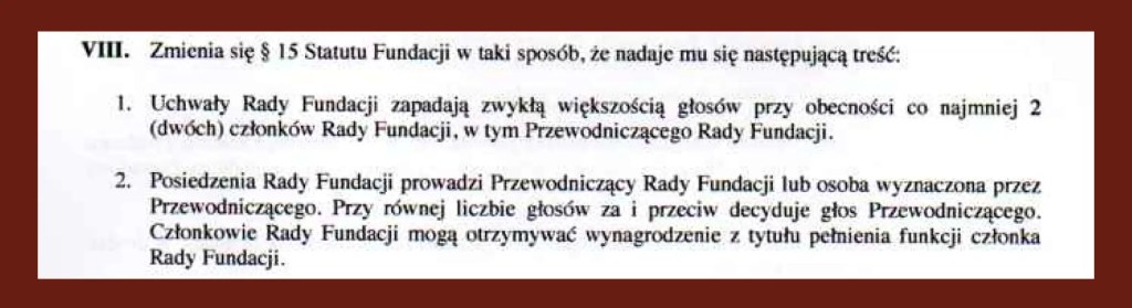 To, co kluczowe, to zmiany kwestii dotyczących wynagradzania osób zasiadających w Zarządzie i Radzie Fundacji, o których Fundatorzy myśleli już w 2020 r., a więc cztery lata wcześniej… Na te zmiany nie zgadzała się Maciocha, ale teraz nie było już przeszkód. Fundatorom chodziło o wyrzucenie ze Statutu zakazu wynagradzania Rady Fundacji i przyznanie wprost takiej możliwości dla osób będących w Radzie.