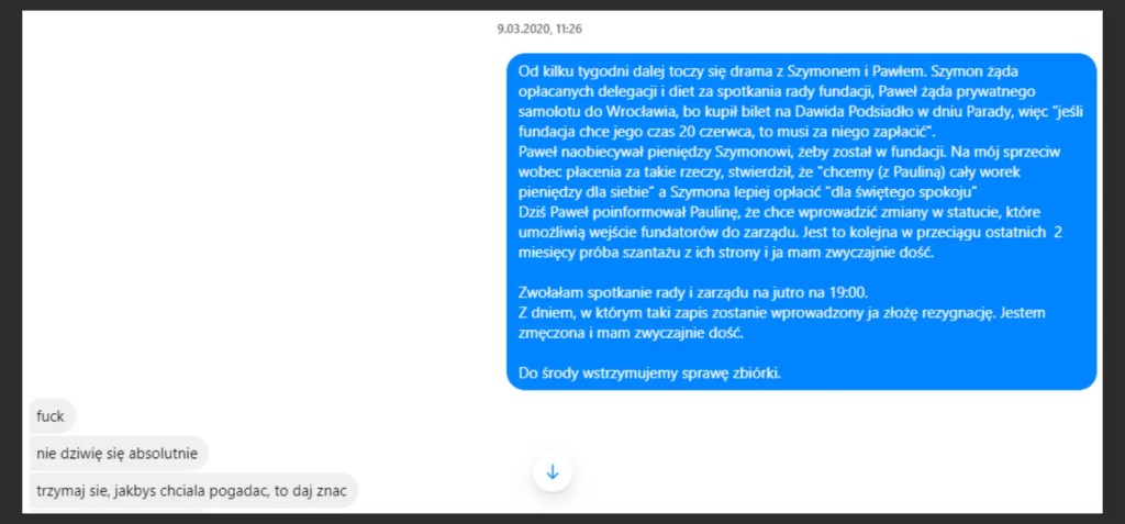 Nie będę tu szczegółowo odnosił się do posta Szymona i wielu nieścisłości czy błędnych informacji, które tam się znajdują, nie ma to bowiem większego znaczenia dla wątków, o których piszę dziś. Może przyjdzie na to czas. Wspomnę tylko, że to Julia Maciocha wraz z nowym Zarządem Fundacji (a nie Fundatorzy) zleciła zewnętrzny audyt finansowo-księgowy, za okres 01.01.2016 – 31.01.2017, a po stwierdzeniu nieprawidłowości skierowała sprawę do prokuratury. O tym więcej będzie w kolejnym odcinku tej historii.
