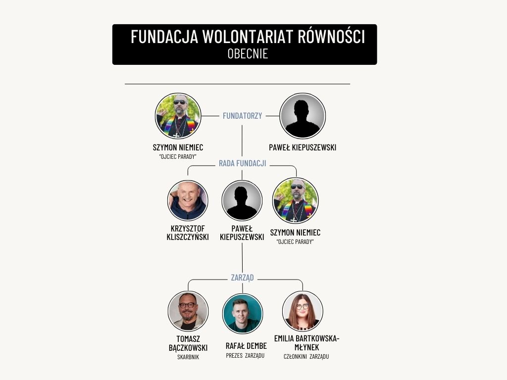 Tyle piękne deklaracje Szymona Niemca. O jego prawdziwych intencjach świadczą jednak kolejne działania, związane z powołaniem Fundacji Wolontariat Równości w 2011 r., a w szczególności Statut Fundacji. Nie znajdziemy w nim bowiem nic o oddaniu prawa do współdecydowania o tym jak Parada Równości ma wyglądać, działać i być widoczna. Statut Fundacji Wolontariat Równości, przyjęty przez obu Fundatorów, tj. Szymona Niemca i Pawła Kiepuszewskiego, pozostawia bowiem absolutną władzę w Fundacji w rękach Fundatorów. Oczywiście Statut przewiduje Zarząd Fundacji, a więc organ mający zarządzać Fundacją, oraz Radę Fundacji, która ma kontrolować Zarząd, ale jednocześnie są tam zapisy, które pozbawiają Fundację jakiejkolwiek niezależności, uzależniając ją od kaprysów Fundatorów.