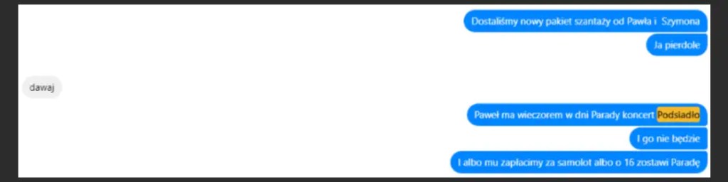 Jakiś czas później w rozmowie Maciochy z zespołem, oprócz wątku zwrotu za samolot, relacjonuje Ona także swoją rozmowę z Kiepuszewskim, który w związku z rozwojem Parady i przybywającymi sponsorami, miał mieć pretensje do Zarządu, że ten nie chciał się “podzielić” kasą Fundacji z Fundatorami oraz sugerować wprost opłacanie Szymona Niemca “dla świętego spokoju”.